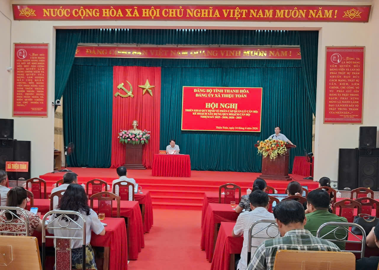 Chiều ngày 14/4/2026, Đảng ủy xã Thiệu Toán tổ chức hội nghị triển khai quy định về phân cấp quản lý cán bộ và kế hoạch xây dựng quy hoạch cán bộ nhiệm kỳ 2026–2031, đồng chí Bùi Trung Hiếu, Phó Bí thư Đảng Thường trực Đảng ủy chủ trì hội nghị. Tham dự hội nghị còn có thủ trưởng các cơ quan, đơn vị, các tổ chức chính trị- xã hội; Lãnh đạo Ban Xay dự đảng; các đồng chí Bí thư Đảng bộ, chi bộ trực thuộc.
