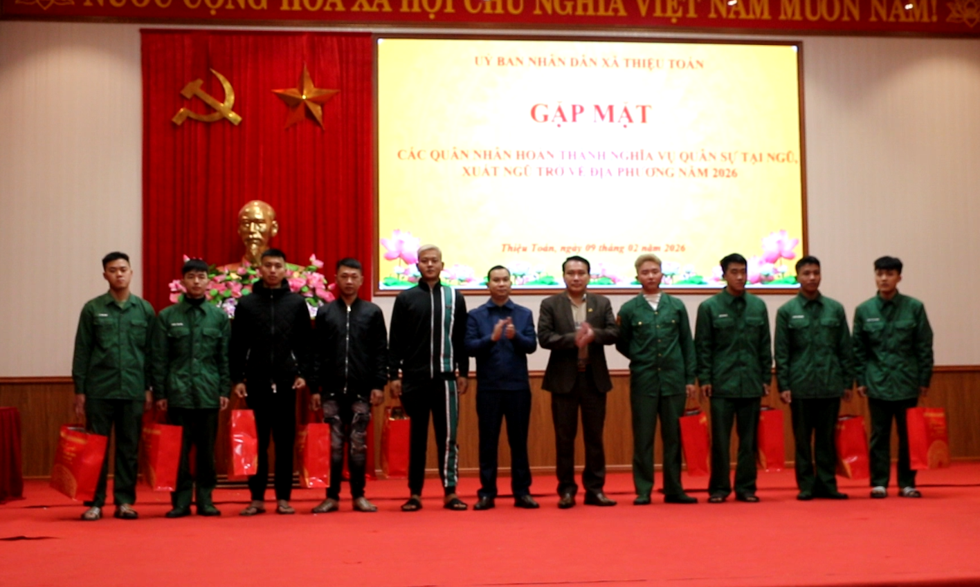 Trong không khí phấn khởi của những ngày đầu năm 2026, Sáng ngày 9/2/2026, Ủy ban nhân dân xã Thiệu Toán đã tổ chức buổi gặp mặt các quân nhân hoàn thành nghĩa vụ quân sự xuất ngũ trở về địa phương. Đây là hoạt động có ý nghĩa chính trị – xã hội sâu sắc, thể hiện sự quan tâm, ghi nhận và tri ân của Đảng, Nhà nước và Nhân dân địa phương đối với những đóng góp, cống hiến của các quân nhân trong thời gian thực hiện nghĩa vụ thiêng liêng bảo vệ Tổ quốc.