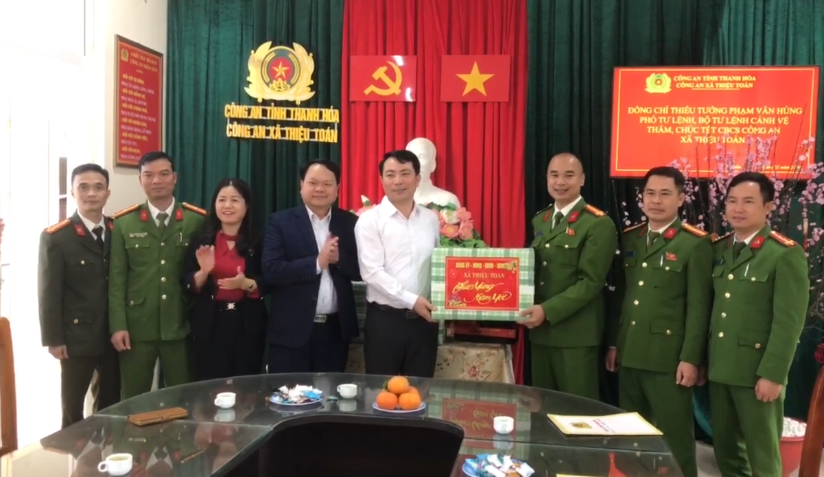 Chiều ngày 12/02/2026, đồng chí Thiếu tướng Phạm Văn Hùng, Phó tư lệnh-Bộ tư lệnh Cảnh vệ cùng các đồng chí Đỗ Ngọc Luân, Bí thư Đảng uỷ, Chủ tịch HĐND xã; Trịnh Đức Hùng, PBT, CT UBND xã và các đồng chí Thường trực HĐND, lãnh đạo UBND, UBMTTQ xã Thiệu Toán đã đến thăm, chúc tết cán bộ chiến sỹ Công an xã Thiệu Toán.