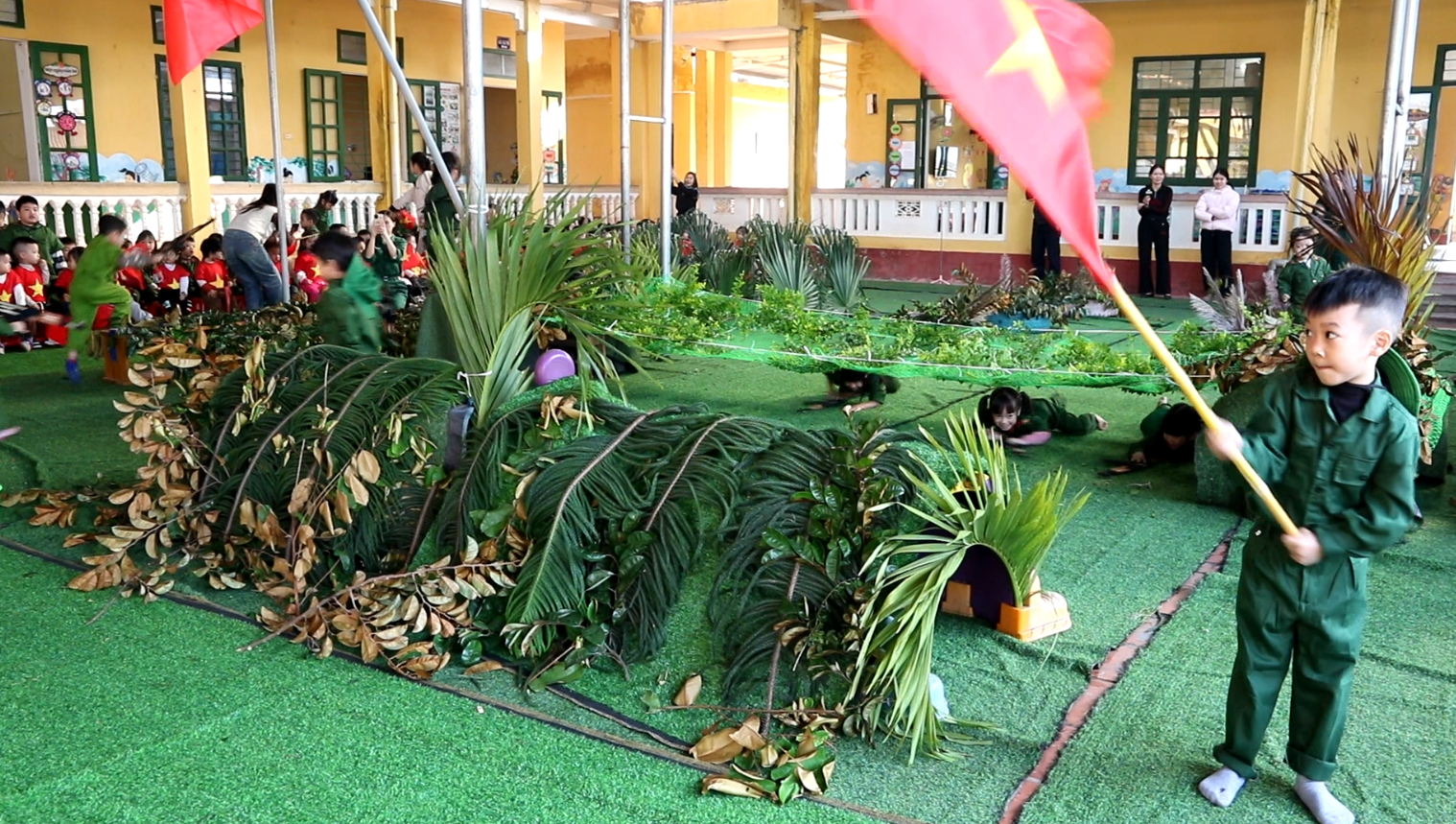 Sau phần biểu diễn đồng diễn, các em nhỏ tiếp tục tham gia hoạt động hành quân đánh trận giả. Thông qua các nội dung như vượt chướng ngại vật, bò chui hầm và bắn súng tiêu diệt mục tiêu…, trẻ được trực tiếp hóa thân thành những người lính, trải nghiệm tinh thần đồng đội, sự phối hợp và ý thức trách nhiệm trong hoạt động tập thể. Các hoạt động được tổ chức khoa học, phù hợp với đặc điểm tâm sinh lý lứa tuổi, đảm bảo an toàn cho trẻ.