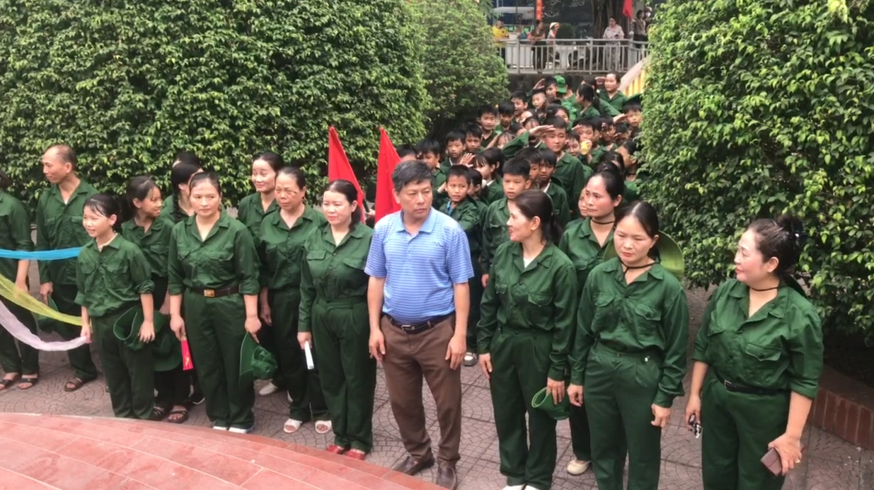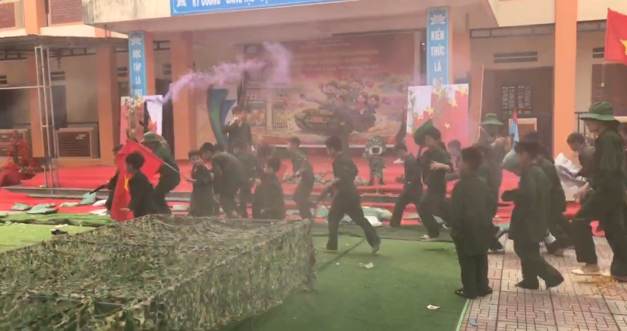 Điểm nhấn đặc biệt của chương trình là chuỗi hoạt động trải nghiệm mang tính mô phỏng, giúp học sinh “hóa thân” thành những chiến sĩ nhỏ tuổi. Các em được tham gia hành quân theo đội hình, mang theo ba lô, mũ tai bèo, tay mang súng, tái hiện hình ảnh những đoàn quân năm xưa vượt qua muôn vàn gian khổ để giành độc lập. Những bước chân tuy còn nhỏ bé nhưng đầy quyết tâm đã thể hiện tinh thần học hỏi và sự nhập vai đầy hứng khởi của các em.