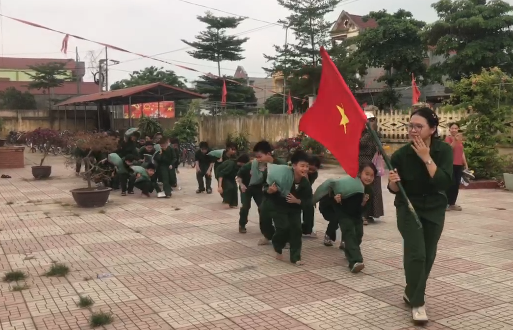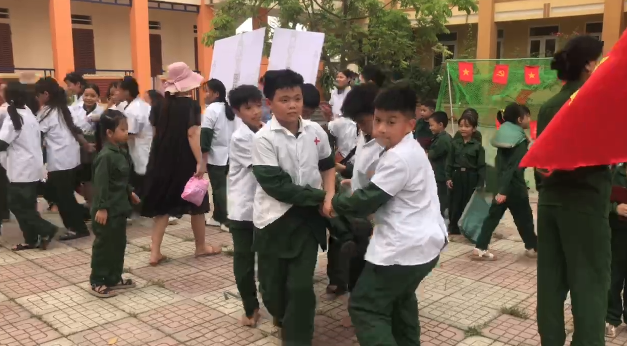 Bên cạnh đó, nội dung tiếp tế và cứu thương cũng được lồng ghép khéo léo trong chương trình. Các “chiến sĩ nhí” được giao nhiệm vụ vận chuyển lương thực, nước uống đến “mặt trận” và hỗ trợ “đồng đội bị thương”. Hoạt động không chỉ rèn luyện kỹ năng làm việc nhóm mà còn giáo dục lòng nhân ái, tinh thần sẻ chia và trách nhiệm với cộng đồng.